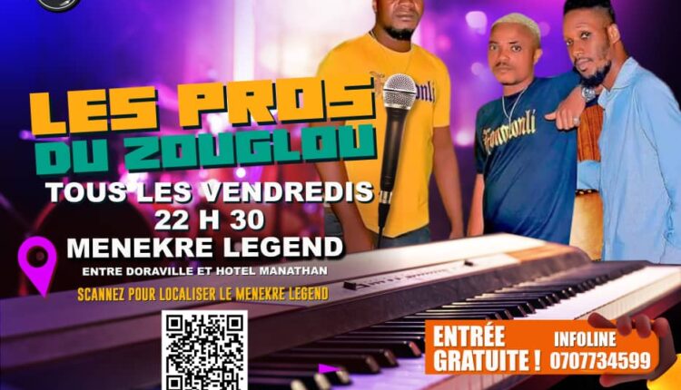 CULTURE Par mistercoul Sur Oct 27, 2023 848 Partager - VOTRE PUB ICI- Listen to this article WEEKEND MENEKRE LEGEND: « VENDREDI 27 NOVEMBRE, SPECIAL ZOUGLOU LIVE COMME TOUS LES VENDREDIS AVEC LES PRO DU ZOUGLOU » EN ATTRACTION : ZOUGLOU & HUMOUR! » RÉSERVATION, INFOLINE : 0707734599 CAM @abidjannews2 848 Partager