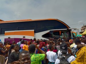 L’atmosphère à la gare est électrique : klaxons, cris de vendeurs ambulants, musique festive crachée par des haut-parleurs… Mais derrière cette animation joyeuse, la fatigue et l’impatience gagnent certains visages. « Je suis venue à 5 heures du matin et je suis encore sur le 10e départ. Je voulais arriver tôt au village… », soupire dame Kouassi Véronique, visiblement exténuée.