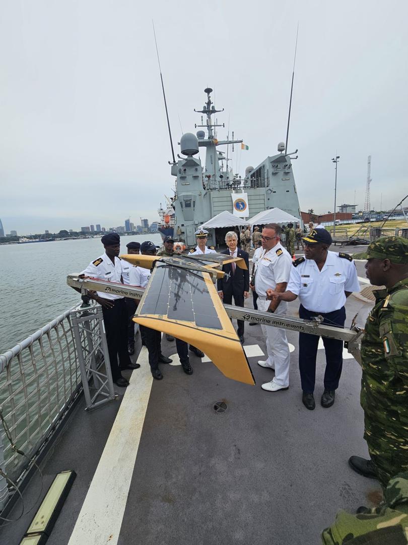 Dans ce cadre, des officiers de l’État-Major de la Marine nationale ont été reçus à bord du bâtiment. À cette occasion, une démonstration statique du système de drone M5D-Airfox, de fabrication espagnole, a été réalisée. Ce système, particulièrement adapté aux missions de surveillance maritime, de sécurité et de contrôle des frontières, constitue un outil innovant au service des opérations de sécurité.